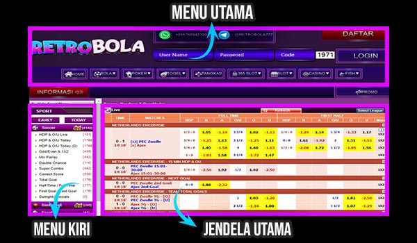 Di Menu Atas ini terdapat kotak User Name, Pasword dan kode Login, dan terdapat juga kotak Daftar dan Login. Disana juga terdapat berbagai permainan yang ada di situs Retrobet88, tentunya kita fokus di Bola.