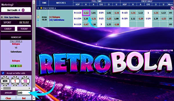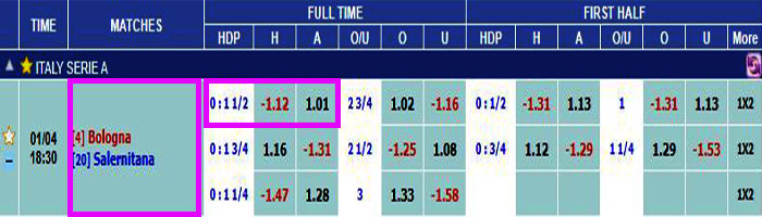 - Berikut ini contoh jika Anda ingin melakukan taruhan bet pada pertandingan Italy Serie A antara Bologna vs Salernitana dengan Bologna yang nge-voor, HDP 0 : 1 1/2 (lihat kotak ungu).